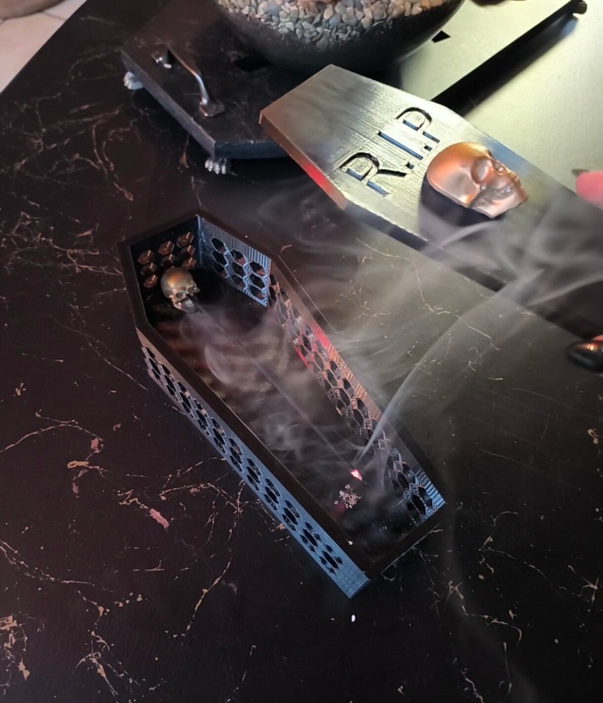 Wierook word in skull geplaatst, deksel dicht