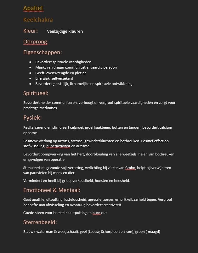 Apatiet stimuleert communicatie en zelfexpressie en bevordert geestelijke, lichamelijk en spirituele groei en ontwikkeling. Het maakt open, sociaal, extravert, levendig en werkt motiverend en activerend. Hiermee gaat het apathie, uitputting, lusteloosheid, agressie, zorgen en prikkelbaarheid tegen. Het vergroot de behoefte aan afwisseling en avontuur en bevordert de creativiteit. Spiritueel bevordert het spirituele vaardigheden en meditatie. Ook fysiek werkt de steen vitaliserend en stimuleert het celgroei, groei van kraakbeen, botten en tanden en de calcium opname. Hierdoor heeft het een positieve werking op artritis, artrose, gewrichtsklachten en botbreuken. Apatiet heeft ook een positief effect op de stofwisseling, hyperactiviteit en autisme.