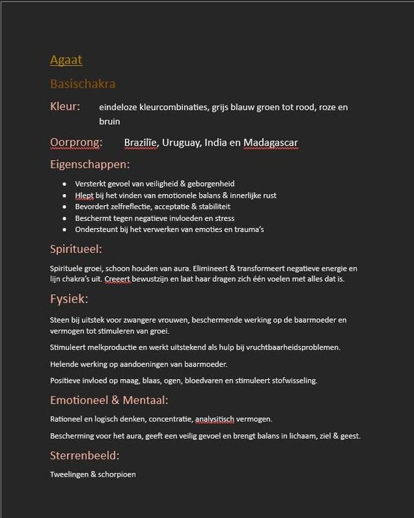 Agaat is een aardende, stabiliserende en beschermende steen. De steen bevordert innerlijke rust en een kalme en nuchtere houding. Het stimuleert spirituele en geestelijke groei door aan te zetten tot zelfreflectie en spoort aan even afstand te nemen en alles wat objectiever te bekijken. Het bevordert rationeel en logisch denken, concentratie, het analytisch vermogen en helpt daarom om praktische oplossingen te vinden voor problemen. Agaat beschermt het aura, geeft een veilig gevoel en brengt balans in lichaam, ziel en geest. Fysiek is agaat een goede steen om tijdens de zwangerschap te dragen (voor zowel moeder als kind) omdat het beschermend werkt, groei stimuleert en een gunstige werking op de baarmoeder heeft. Het heeft een positieve invloed op maag, blaas (bij bijvoorbeeld een blaasontsteking), ogen, bloedvaten en stimuleert de stofwisseling.